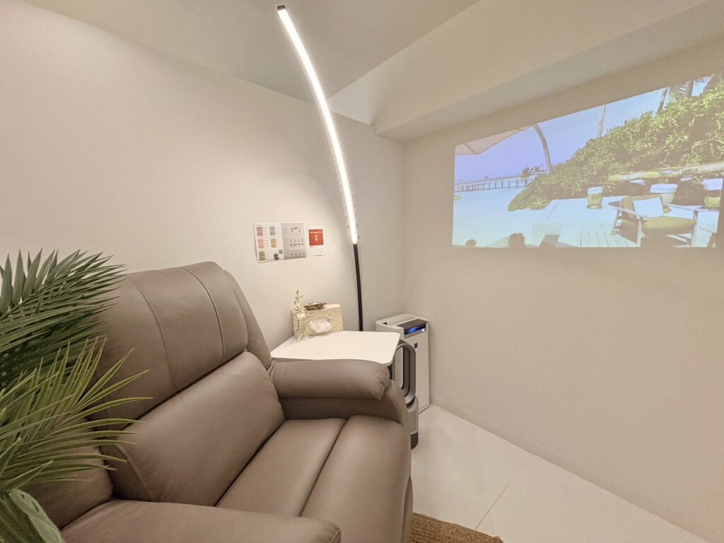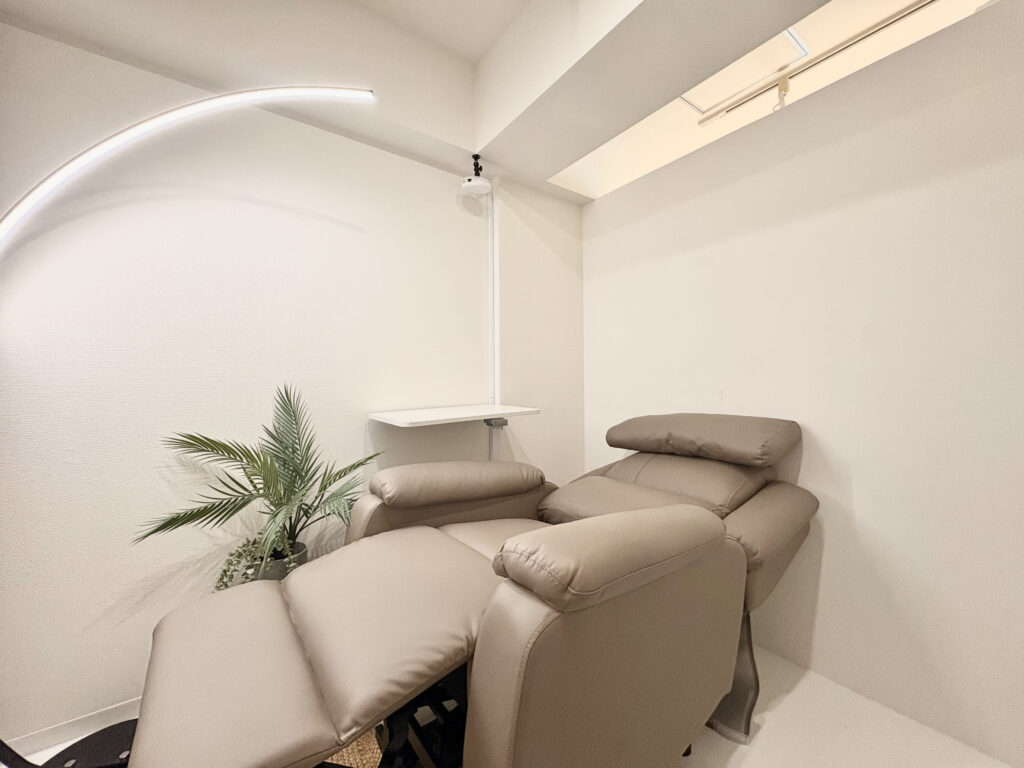 室内は用途に応じた2室(spaceA・spaceB)を用意し、ソファーのある共用スペースも自由に利用可能です。spaceAはリクライニングチェアがベッド状まで稼働可能でエステ・ヘッドスパにおすすめ、spaceBはソファ状まででネイル・マツエク向きです。