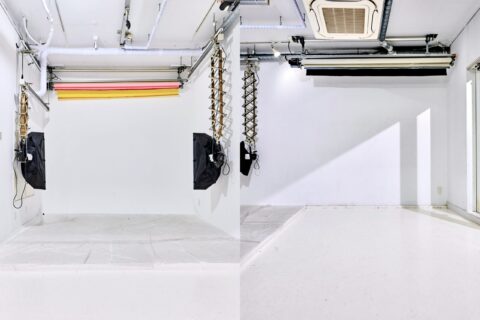 90㎡超のゆったりとした広さで、天井高 3.7m、奥行き 9m。人物撮影に適したサイズの白ホリゾント、電動バックペーパー巻取装置2箇所、天井備付けバンクライト、メイクルームを完備しています。