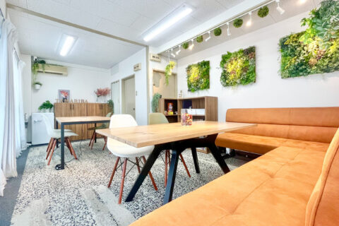 室内は用途に応じた2室(spaceA・spaceB)を用意し、ソファーのある共用スペースも自由に利用可能です。spaceAはリクライニングチェアがベッド状まで稼働可能でエステ・ヘッドスパにおすすめ、spaceBはソファ状まででネイル・マツエク向きです。