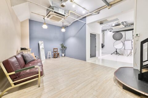 松濤スタジオ元チーフスタッフプロカメラマン監修による白ホリ+ゆったりした広さと高天井を活かした様々なシーン(白壁、ブルーグレー壁、ベージュ壁あります)での撮影が可能です。
