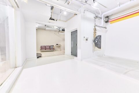 90㎡超のゆったりとした広さで、天井高 3.7m、奥行き 9m。人物撮影に適したサイズの白ホリゾント、電動バックペーパー巻取装置2箇所、天井備付けバンクライト、メイクルームを完備しています。